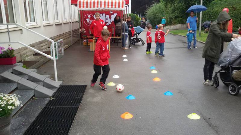zugegen. Am Kicker, im Dribbling-Parcour und an der Minitorwand waren die Kinder, trotz des mäßigen Wetters, nicht aufzuhalten.