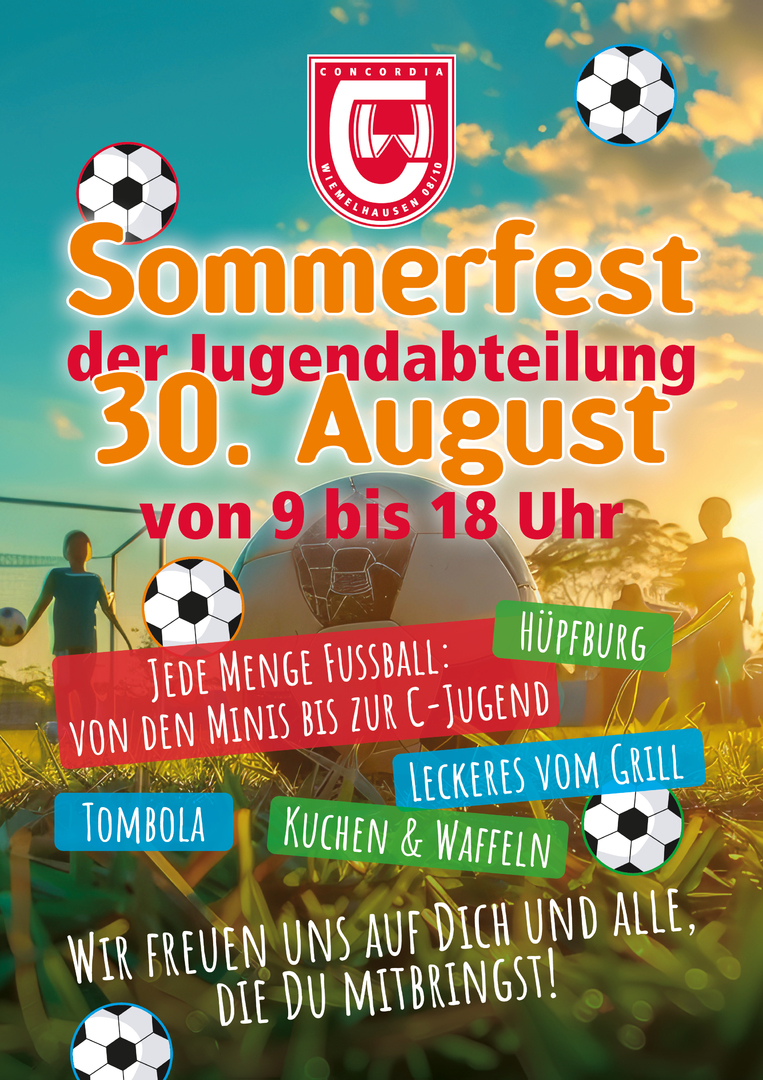 Am 30.08.25 findet unser großes Sommerfest zur Eröffnung der neuen Saison statt. Tombola, Hüpfburg, viele Leckereien und vor allem tolle Fußballspiele den über den ganzen Tag verteilt, wir freuen uns auf euch!