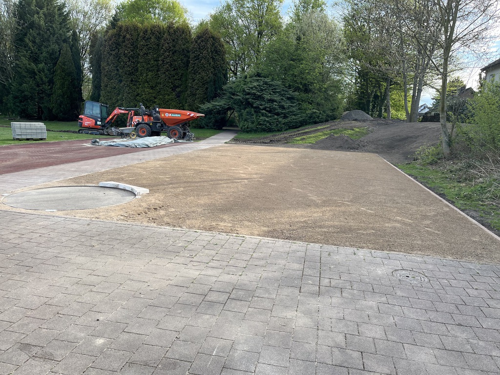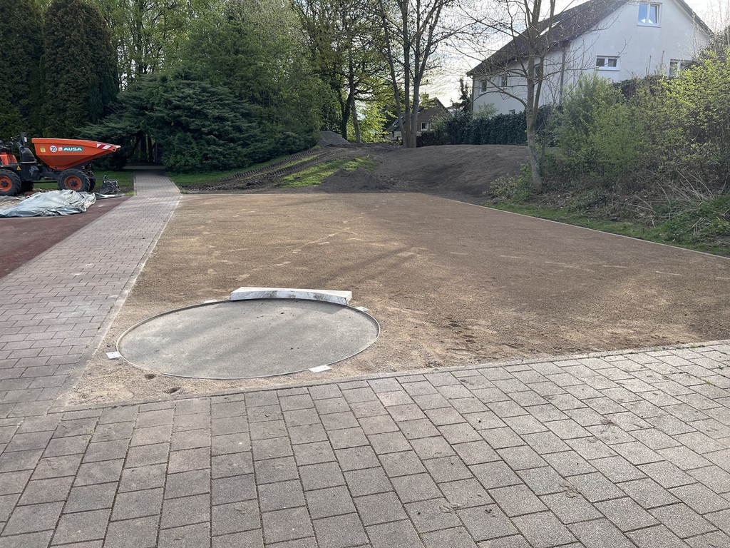 Heute (9. April) werden die Pflasterarbeiten des Fundaments für ein kleines Holzhaus durchgeführt. Die versetzte Kugelstoßanlage hat ihre neue Zuwegung schon bekommen und ist damit fertiggestellt. Offene Flächen werden mit Mutterboden aufgefüllt und mit Rasen neu eingesät. Zum Teil sind die Zaunaufstellungen mit dem vorhandenen Material erledigt; die neuen, restlichen Zaunelemente kommen in ca. zwei Wochen, dann soll auch die neue Netzanlage geliefert werden. Voraussichtlich sind Ende April alle Arbeiten abgeschlossen, sodass der Beachvolleyballbetrieb ab dem 1. Mai starten kann. Wir freuen uns drauf!
